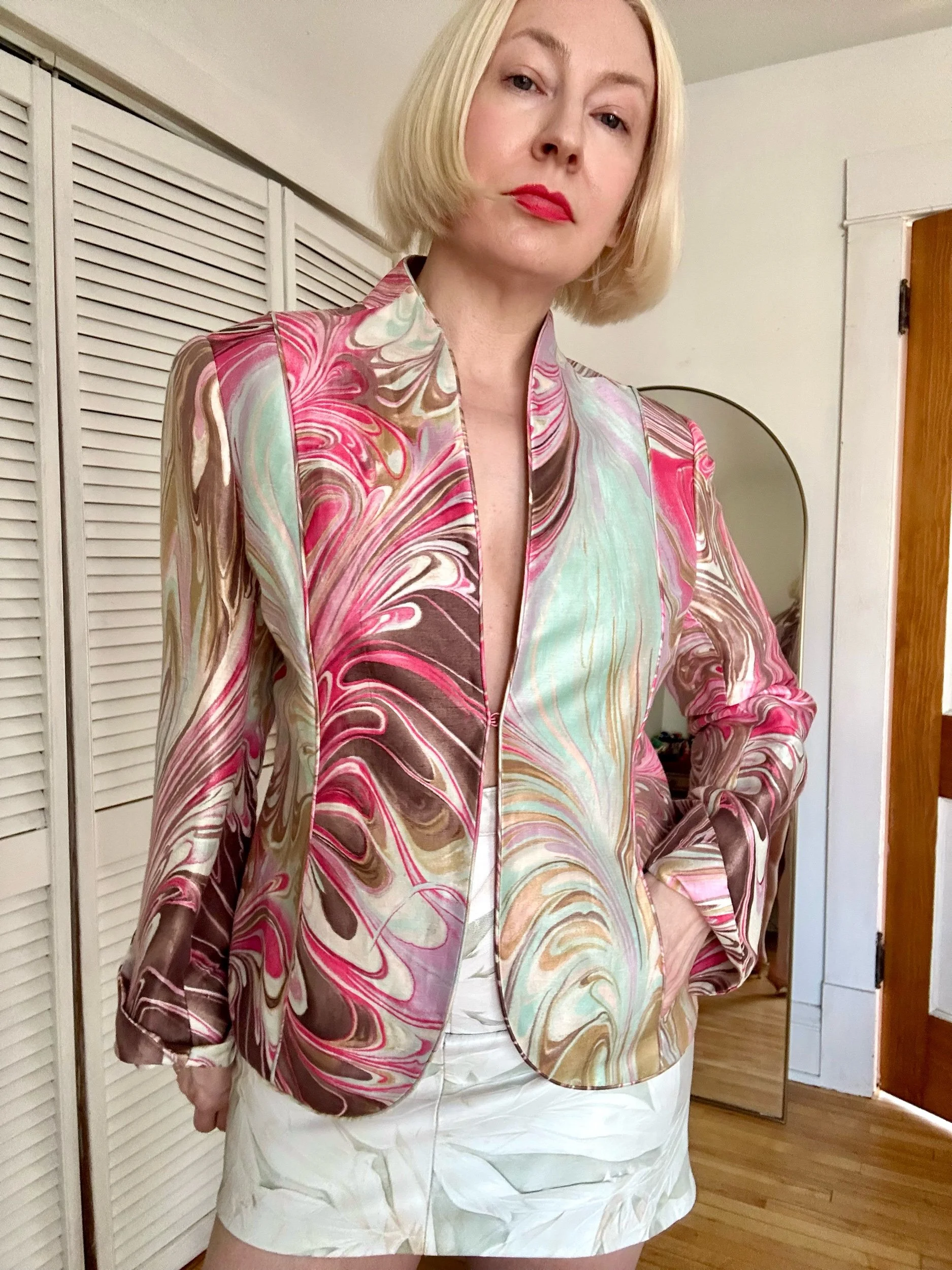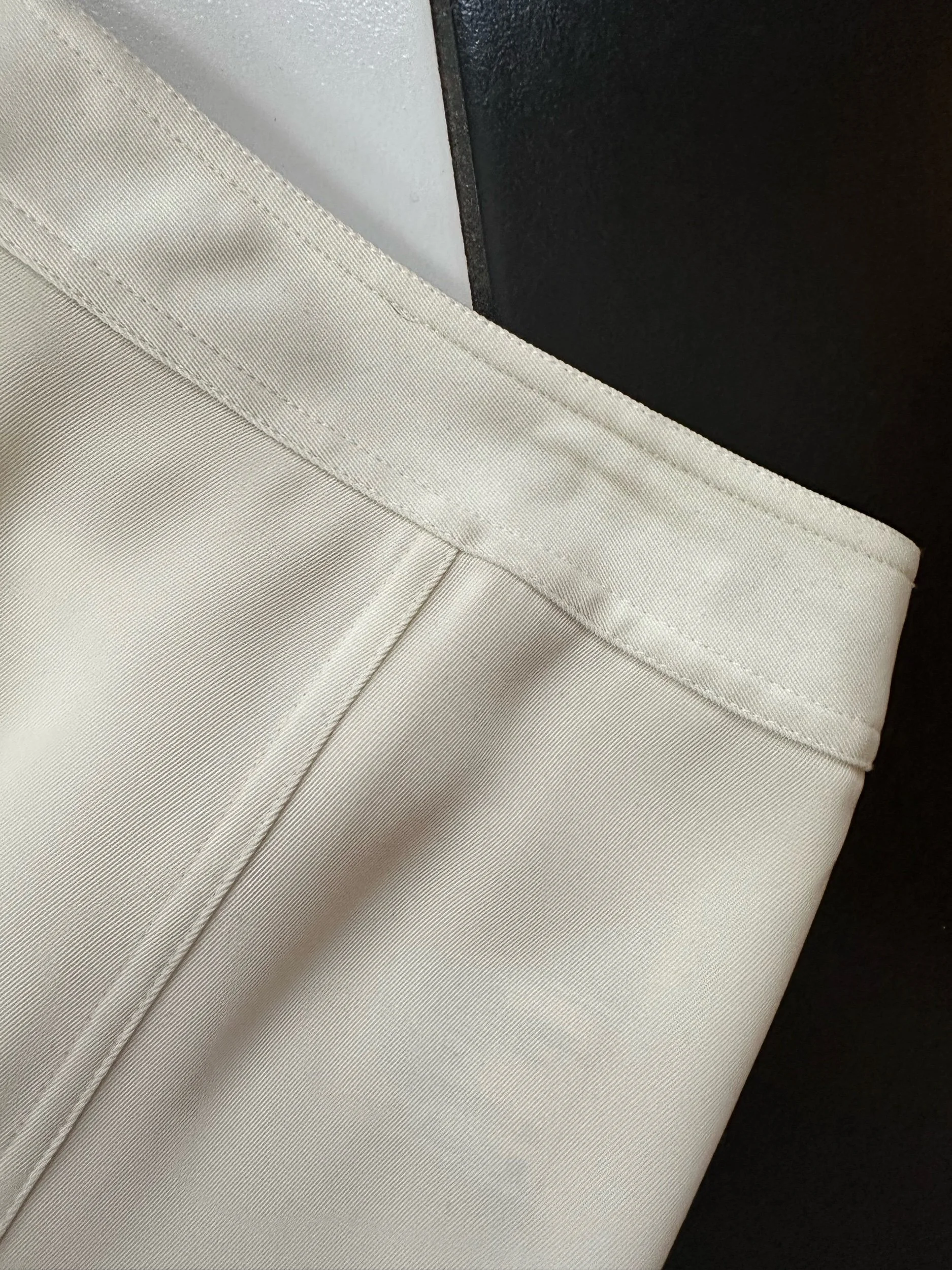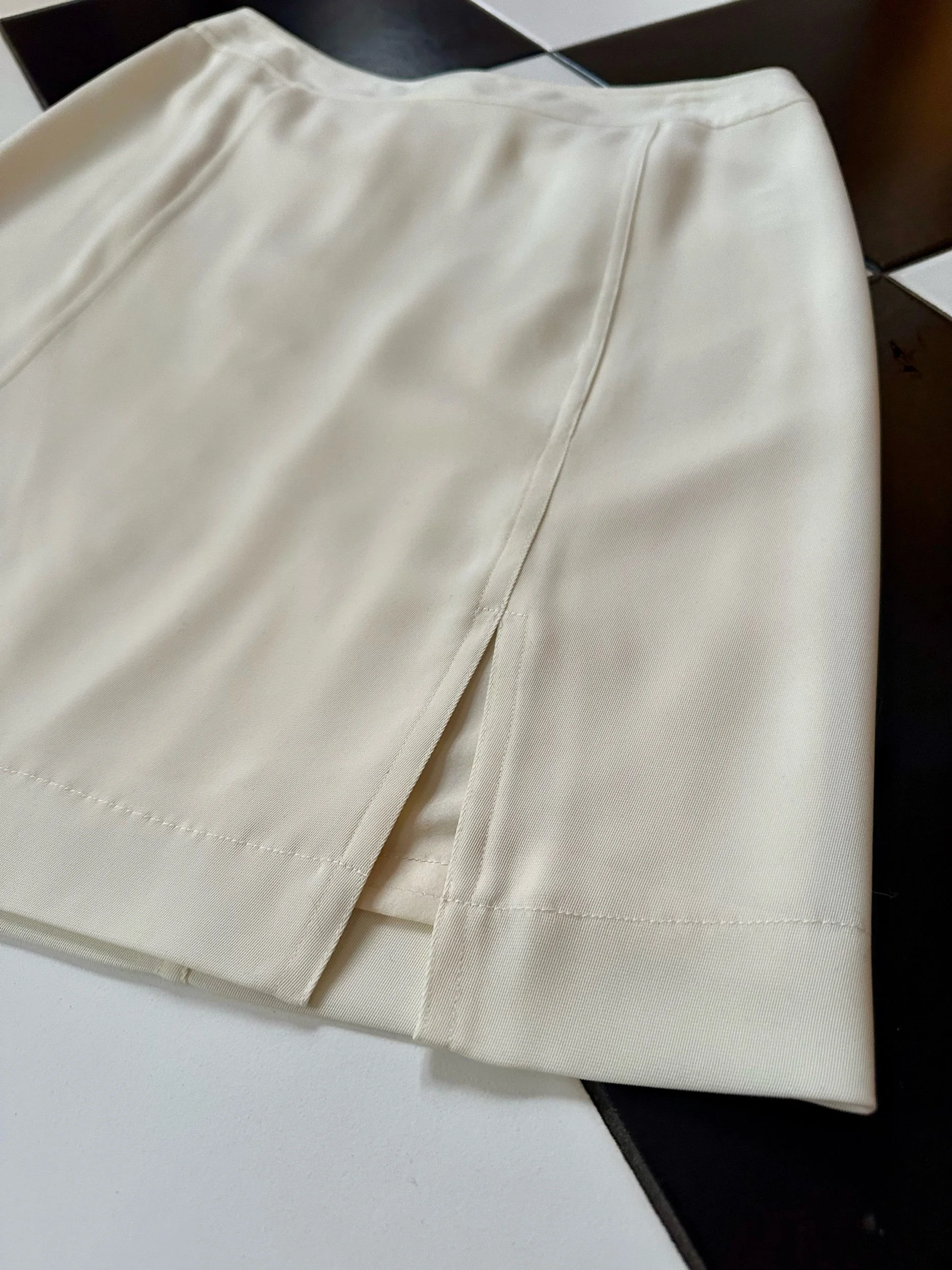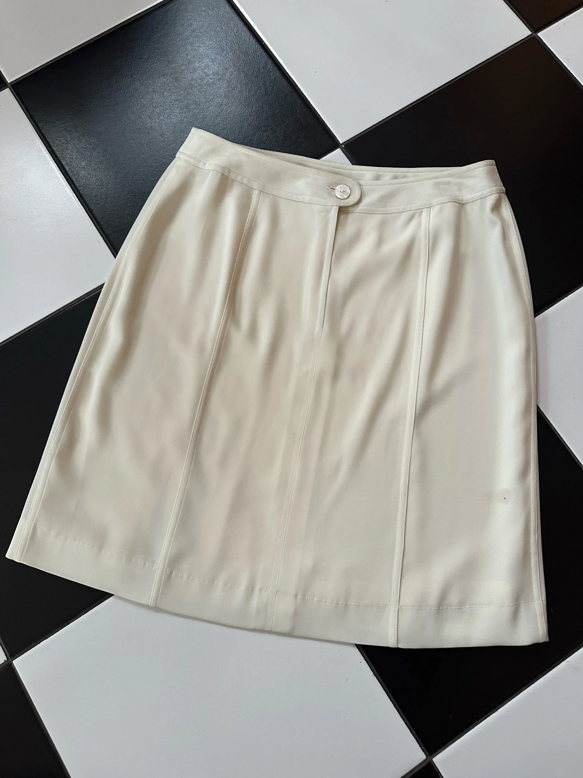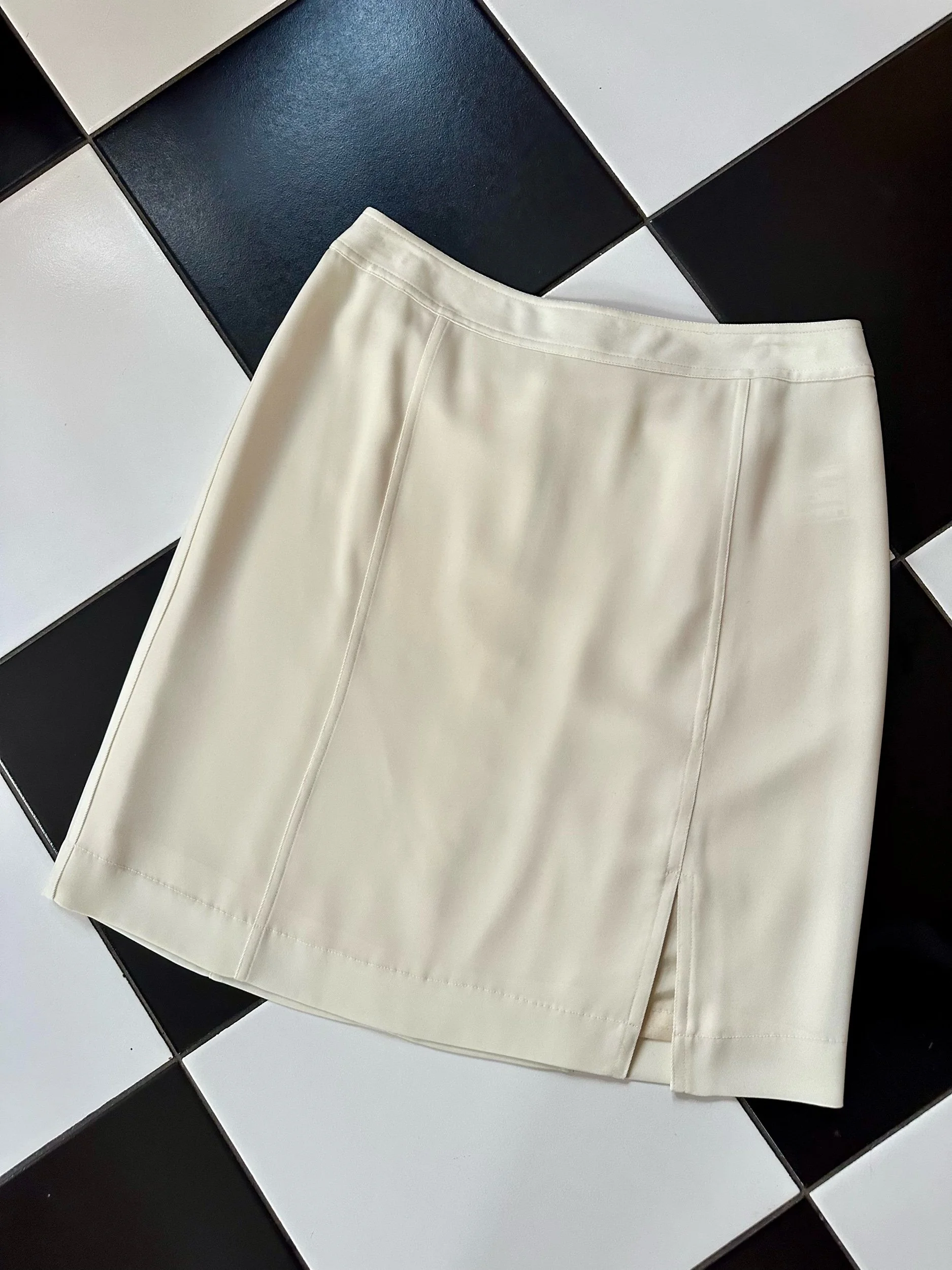 A timeless wardrobe essential from the Spring 1998 collection by Chanel, this sleek ivory skirt embodies the house’s signature understated elegance, cut in a clean, straight silhouette that skims the body with a fluid, slinky drape.