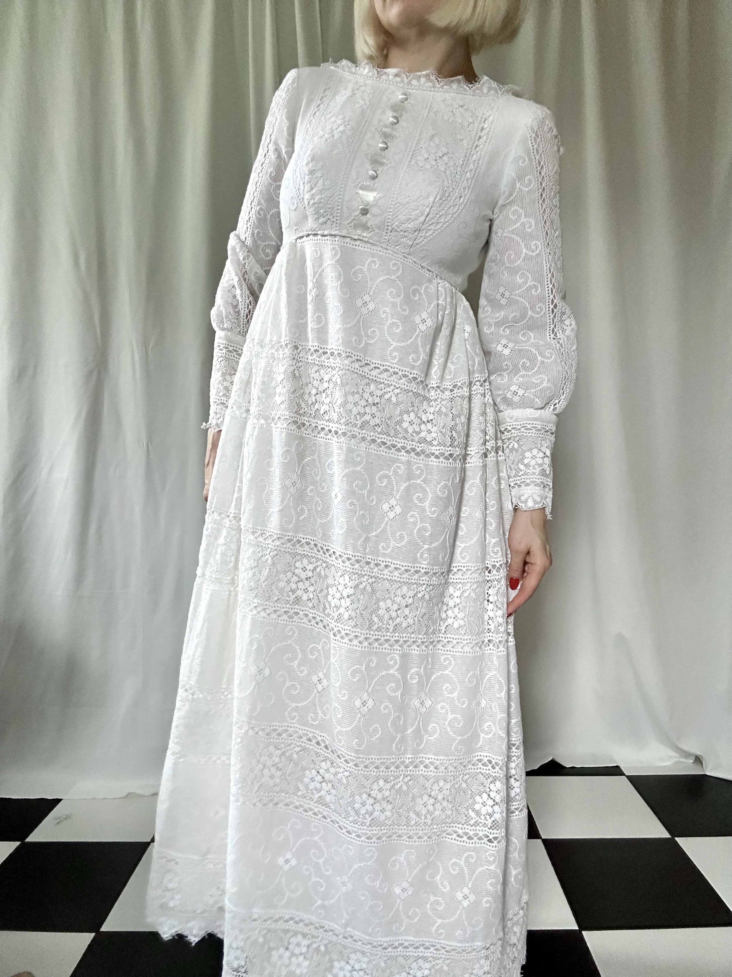 Vintage 1970s White Lace Cotton Long Sleeve Wedding Tea Length Dress - XXS / XS