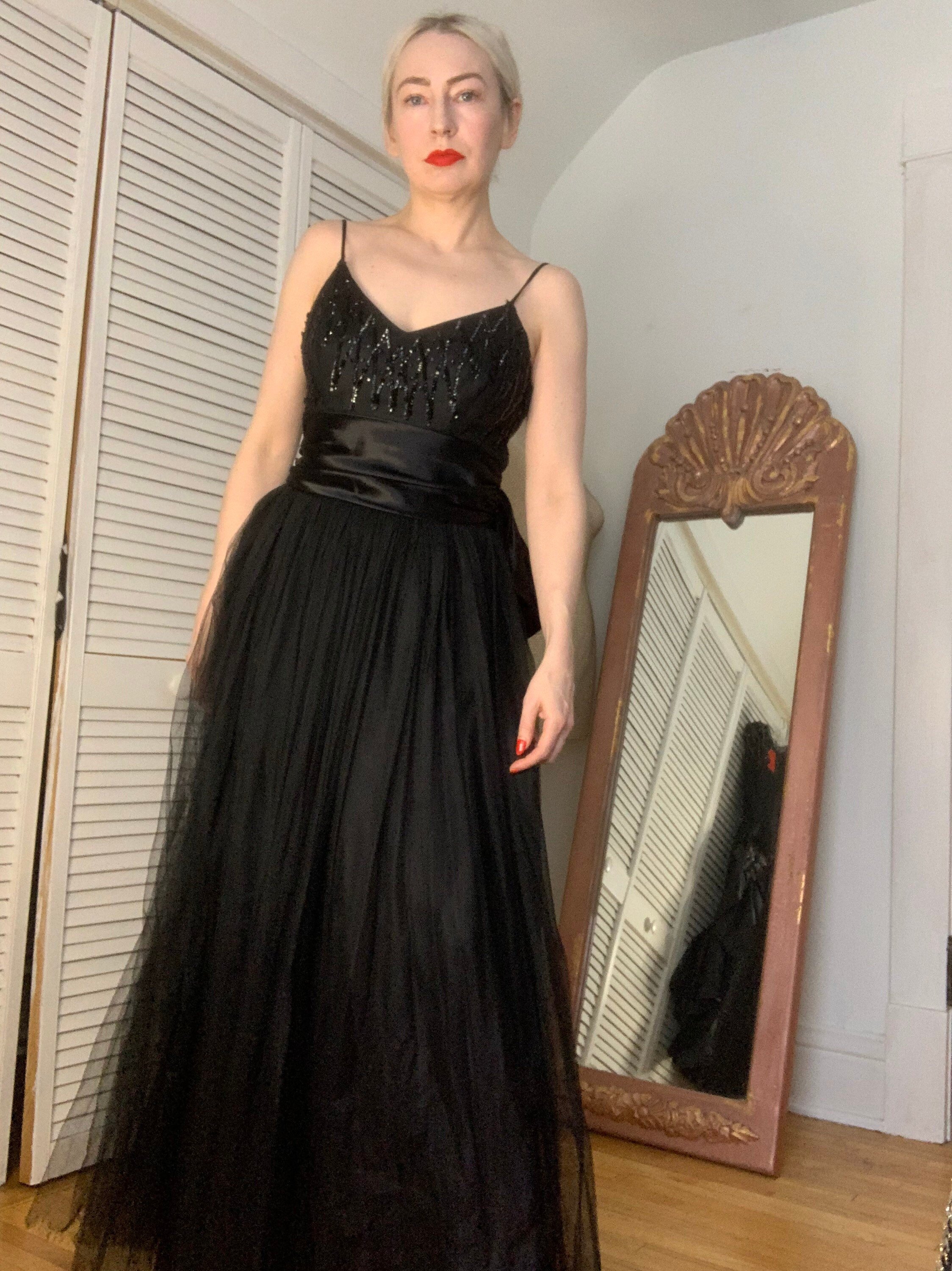 Vintage ‘50s Harold’s Black Tulle Spaghetti Strap Gown Maxi Dress with Sequin Bust & Satin Cummerbund & Bow. Raw hem. Hook & eye and zip closure at side. Some faint flaws in tulle at bust. Still a beautiful, special and wearable piece. Fabrication unknown. From Harold’s Department Store in Minneapolis, MN.