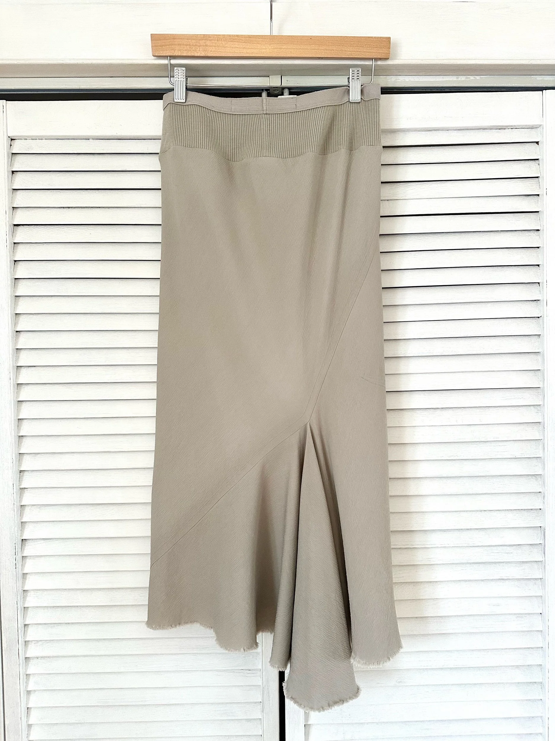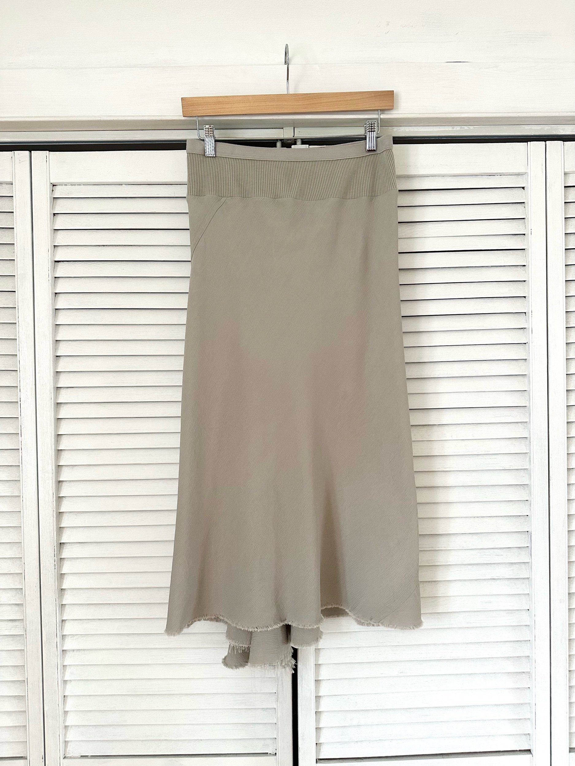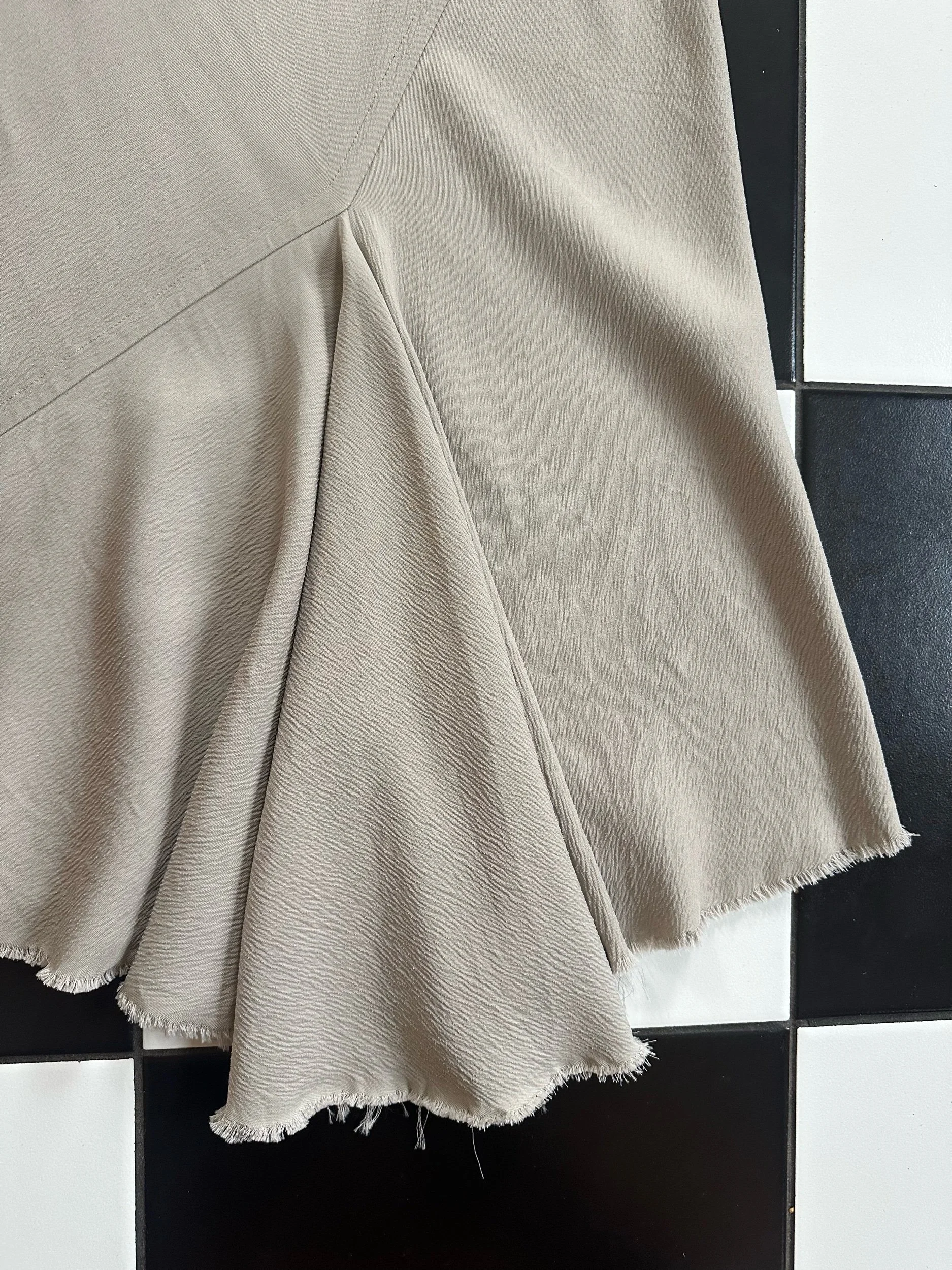 The asymmetrical fishtail hem is defined by a gusseted back panel and elongated drape, creating movement and dimension from every angle. Raw edges and subtle seaming enhance the garment’s understated, avant-garde finish. Skirt can be worn back to front for added versatility.