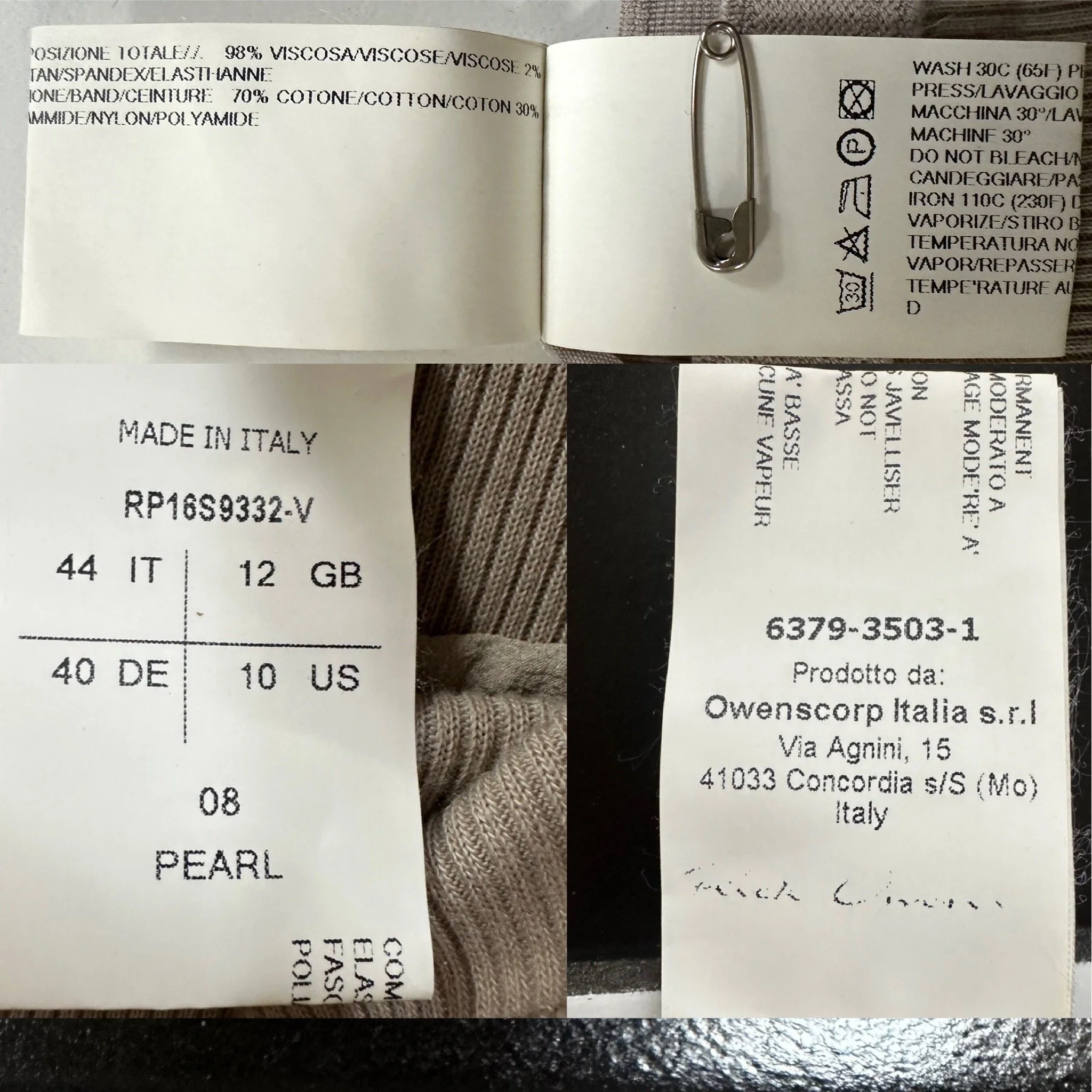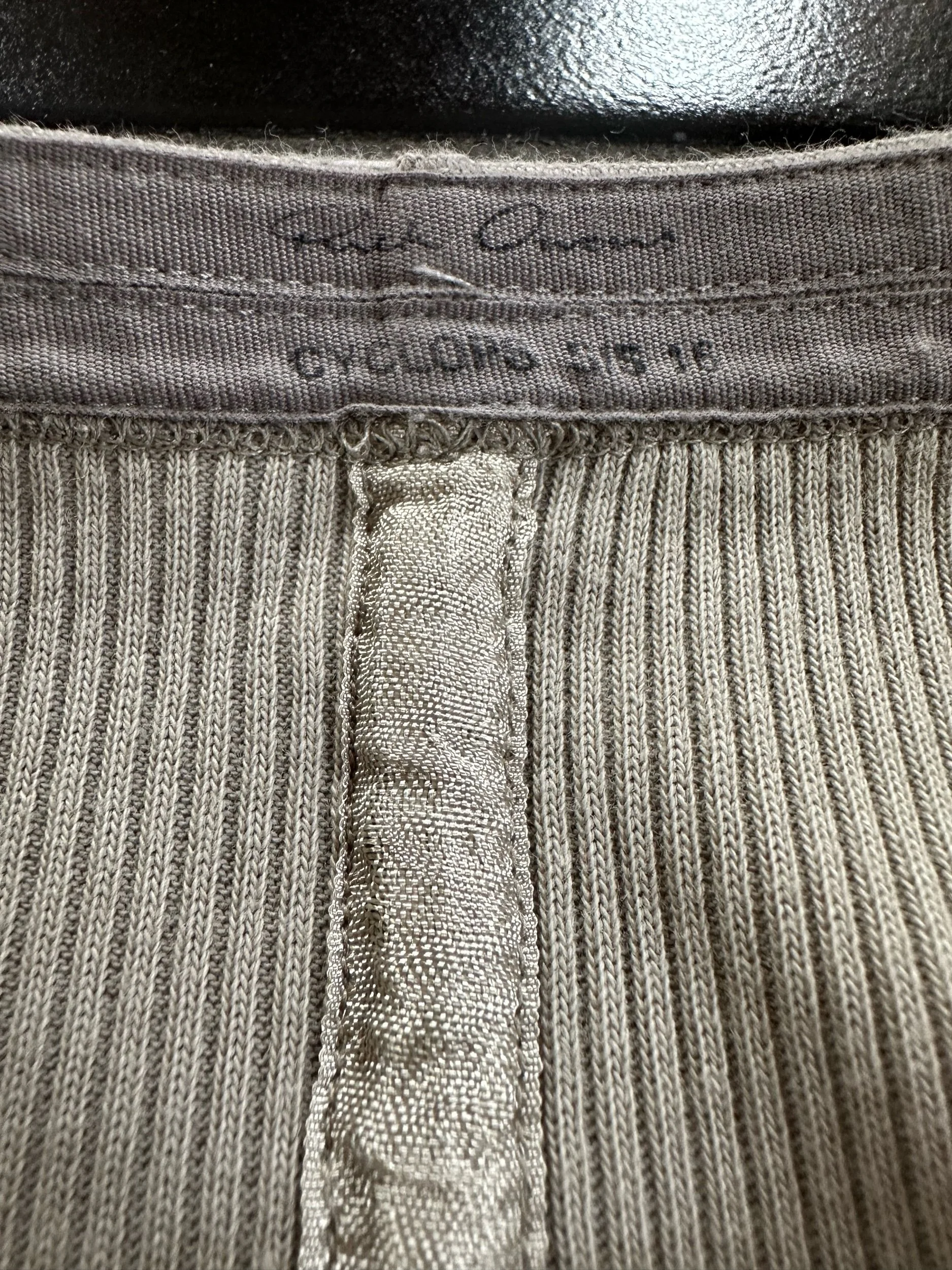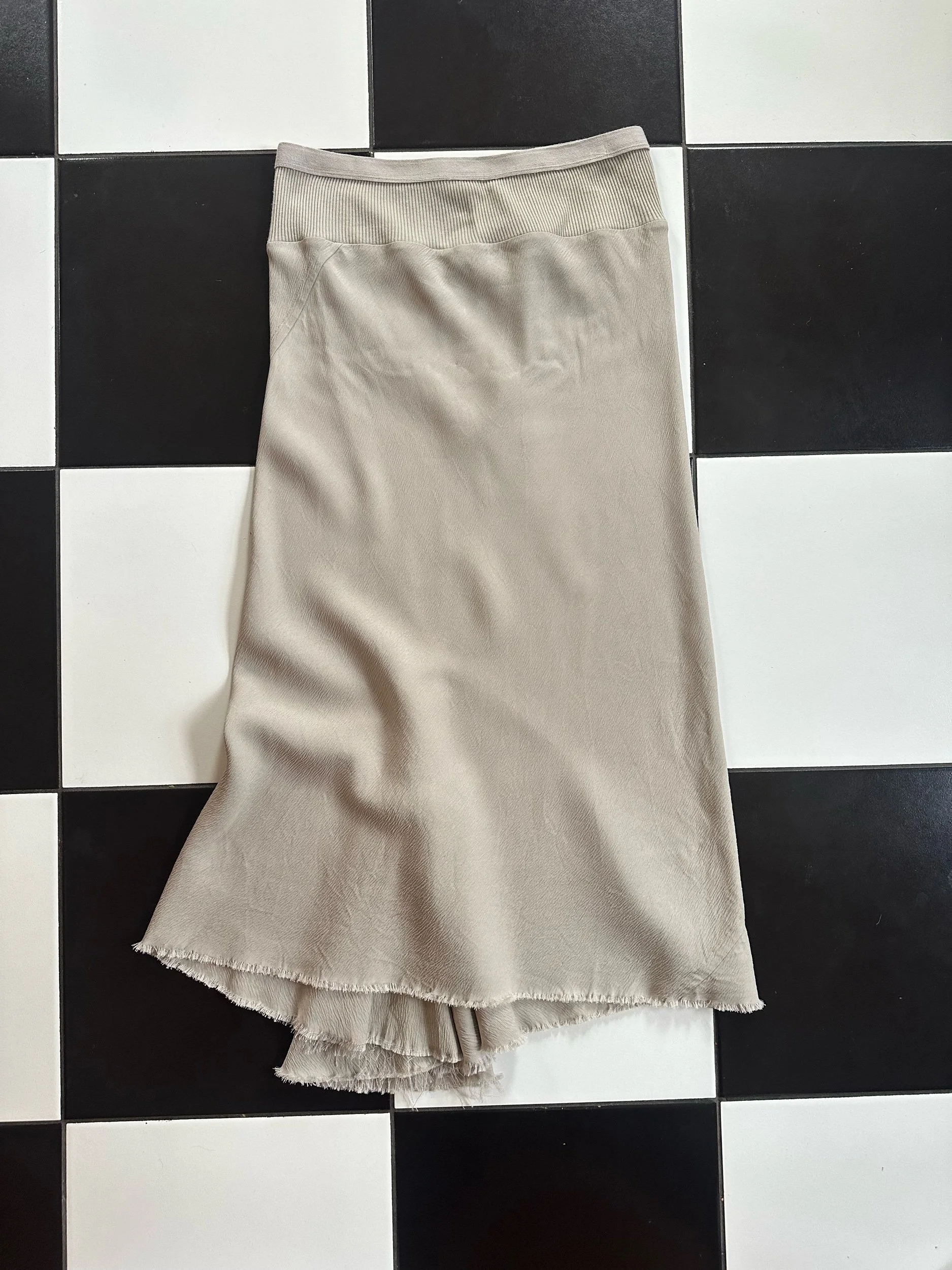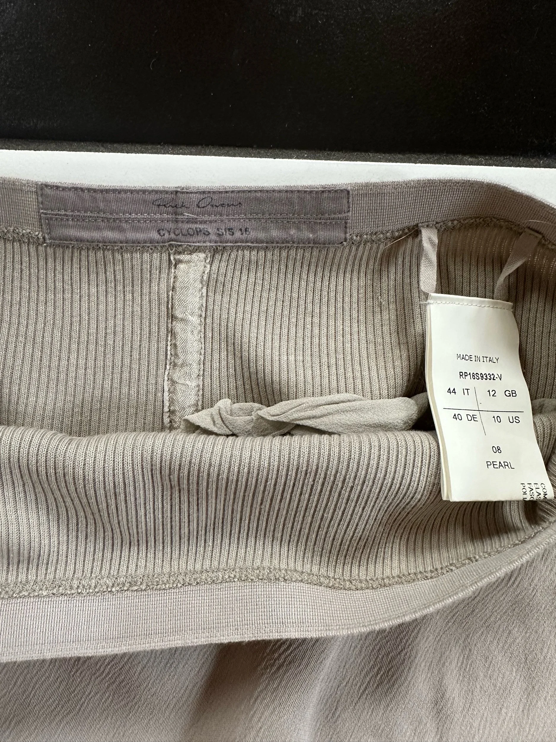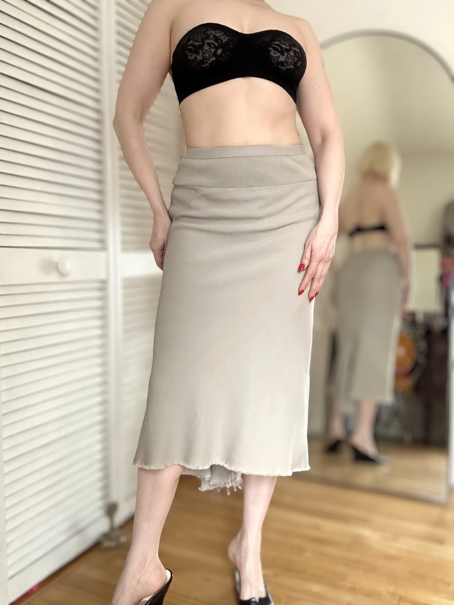 Rendered in a soft pearl gray viscose/cotton blend, the silhouette is shaped through bias-cut construction, allowing the fabric to fall naturally along the form. A wide ribbed knit waistband—a hallmark of Rick Owens design—offers both comfort and architectural balance, grounding the otherwise fluid shape.