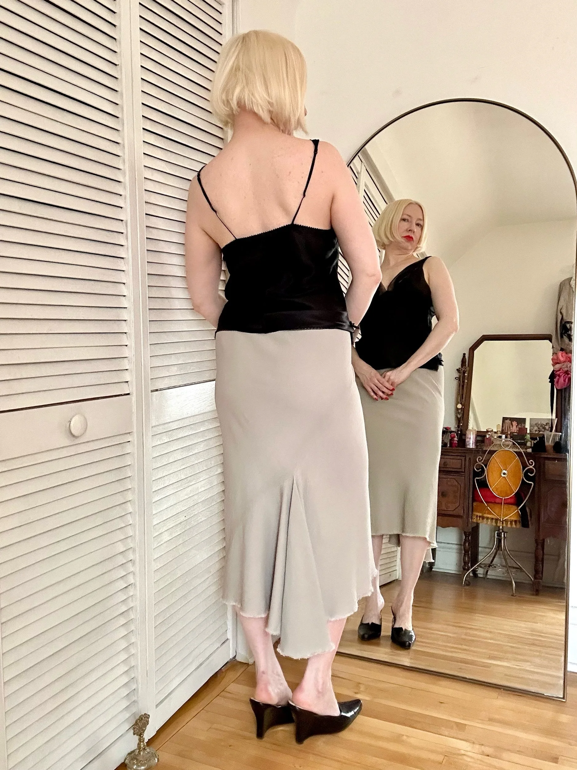 Marked size 10. Bias-cut construction allows for flexibility through the hips and body. Best suited for a modern S–M depending on desired fit. Please refer to measurements and description for fit and condition. All sales final.